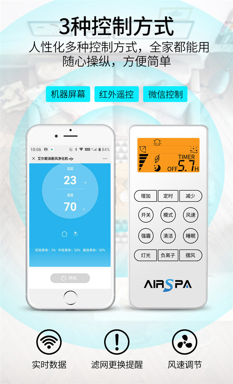 5、智能WIFI控制,智能化霜,濾網更換提醒,擺風功能、空氣指示燈